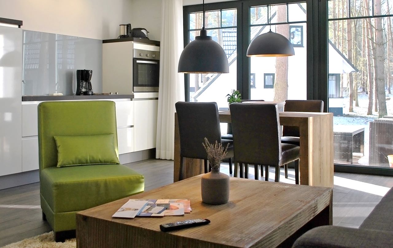 Spacious modern semi-detached houses in beautiful natural resort of 14 acres on the fabulous Lake Drewitz in the vast Lake District Mecklenburg-Vorpommern. The cottages are located in a nature resort right on the crystal clear lake offering a restaurant, indoor pool, sauna and many facilities for children. The houses all have a cosy living area with luxury furniture, fully equipped kitchen, 2 double bedrooms, 1 bathroom, Wi-Fi, TV and terrace. Free entrance to the indoor swimming pool and sauna for guests. Laundry service possible for a small fee.